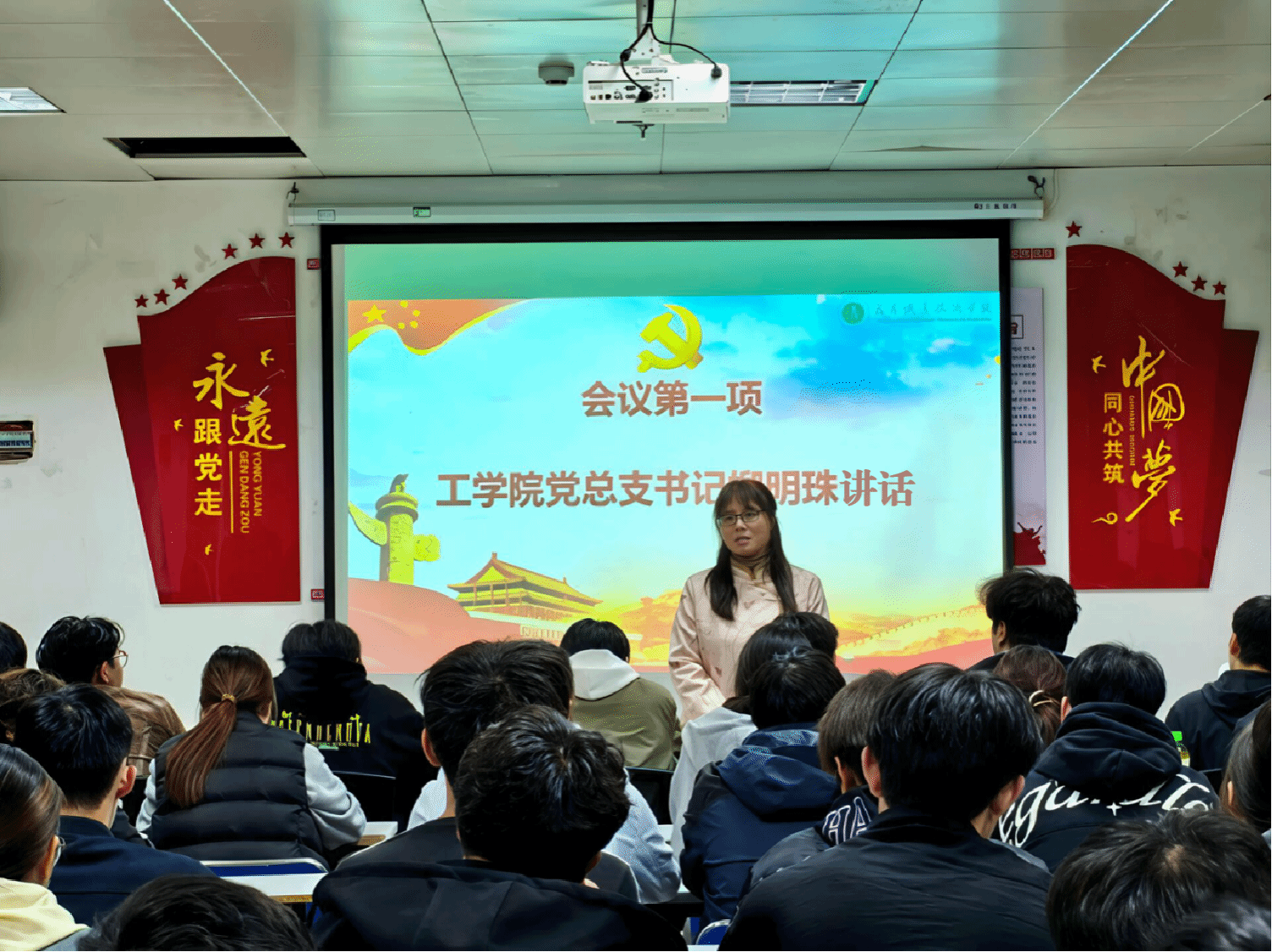 工学院学生党支部宣传委员吴世杰,以“习近平新时代中国特色社会主义思想”为主题,从“十个明确”“十四个坚持”系统阐释新时代坚持和发展中国特色社会主义的核心要义。结合电教片《路》引导学员感悟中国道路与制度优势,并围绕“中国特色社会主义制度优越性体现在哪些方面”组织讨论,用高铁奇迹、脱贫攻坚、疫情防控等鲜活事例激励大家坚定制度自信,砥砺初心使命,奋发向前。
