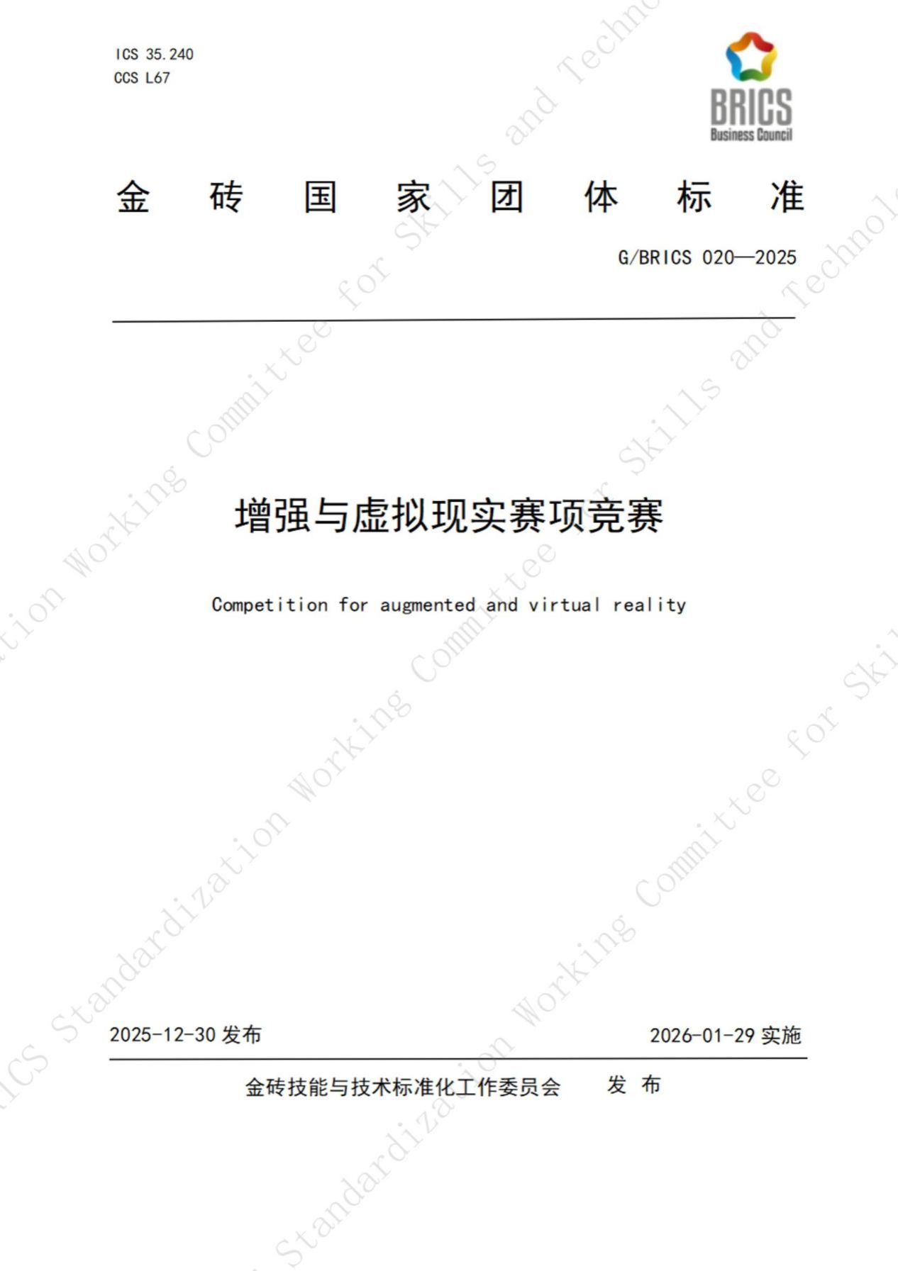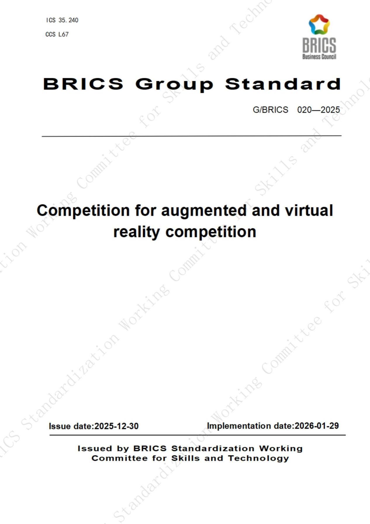 此次发布的3项金砖国家团体标准包括《增强与虚拟现实赛项技能》《增强与虚拟现实赛项课程》《增强与虚拟现实赛项竞赛》,编号分别为G/BRICS 018-2025、G/BRICS 019-2025、G/BRICS 020-2025,于2025年12月30日正式发布,2026年1月29日起实施。其中,《增强与虚拟现实赛项竞赛》标准由咸宁职业技术学院主导编制,以及来自巴西、南非、俄罗斯、马来西亚等金砖国家相关机构共同参与参编,覆盖竞赛组织、技术要求、评判规则、安全保障等全流程,为金砖国家范围内AR/VR领域技能竞赛提供了统一、规范的操作指南。