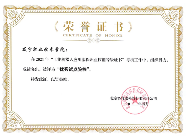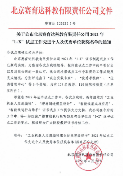 近日,教育部工业机器人应用编程职业技能等级证书培训评价组织北京赛育达科教有限责任公司公布2021年“1+X”试点优秀单位获奖名单,我校获批优秀试点院校。