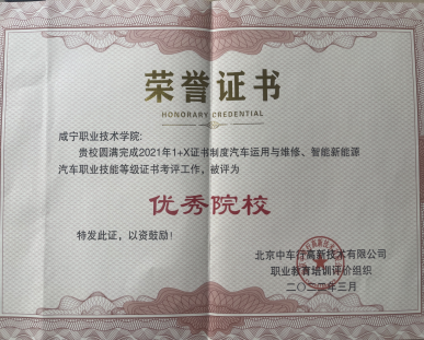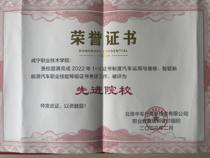2022年度,我校新能源汽车技术专业在1+X证书制度考评工作中表现良好,做到课证融通,考核成绩优良、通过率高,圆满完成了各项考核工作任务,被北京中车行高新技术有限公司职业教育培训评价组织评为“先进院校”。
