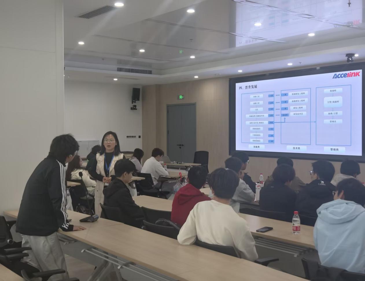 在企业相关负责人的带领下,师生一行先后参观了企业生产车间、研发中心、办公区域及企业文化展示区。同时,企业人力资源负责人围绕人才招聘标准、实习岗位设置、就业薪资待遇、职业素养要求等学生关心的问题,进行了细致解读。